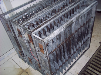 排烟罩分多种结构形式,箅子置于烟罩排油槽上的是一种;还有带喷水装置的运水烟罩;另外是(日本进口的)把箅子做成过滤网直接净化油烟且有防火功能的烟罩。我们把箅子(过滤网)取下放入专用容器中,加入金属清洗剂浸泡,然后用高压水冲洗干净;烟罩表面的油污首先用清洗剂喷洒稍侯片刻使油污被清洗剂基本溶解后再使高压水冲洗。 13466305268